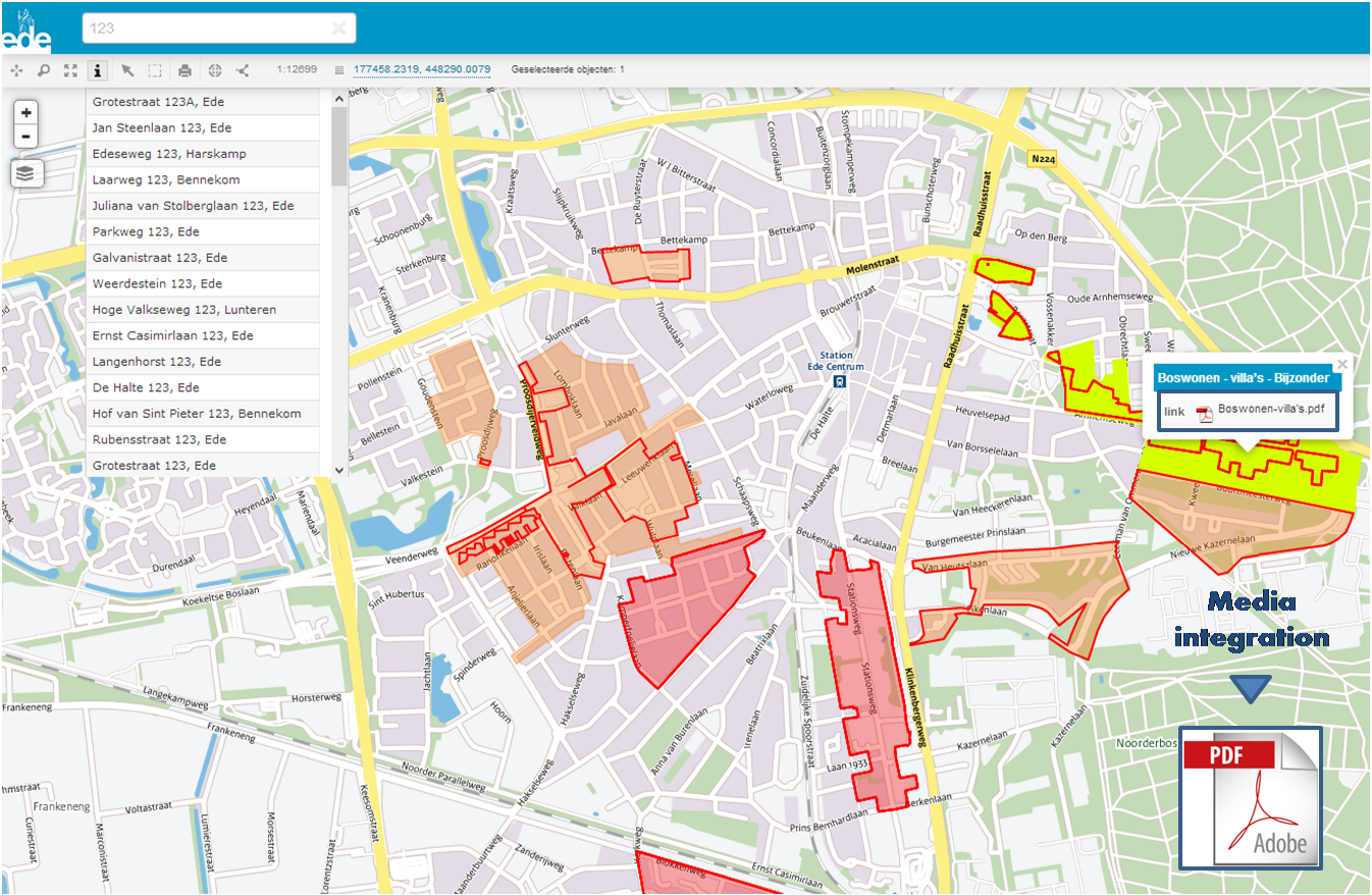 GIS Cloud Map Portal is an ideal solution for the municipality of Ede as it provides customization options in terms of language, layout view and accessibility. Ede Map Portal uses the fastest vector based engine in the world, providing a more accessible way of visualizing, analyzing and sharing geospatial data. End users have an open access to their parcel and address data, which is searchable by the address. Different media (ie. photos, videos, PDF documents) can be attached to the data and easily accessed through the Map Portal.