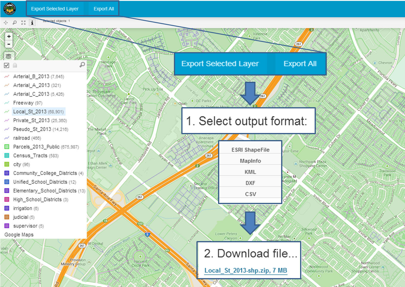GIS Cloud Map Portal was an ideal solution as it provides customization options for the layout of the portal itself and it uses the fastest vector based engine in the world. End users would simply sign up for free in Map Portal, which gives an insight to authorities in terms of who is downloading the data. Map Portal Export supports various data formats (.xls, .shp, .dxf, .csv, .kml, etc.) which made it easy to the County personnel to publish their land base and parcel data to the portal for the download by the public. This proved to be an affordable and user-friendly solution for OC by reducing time, effort, paperwork and support costs.
