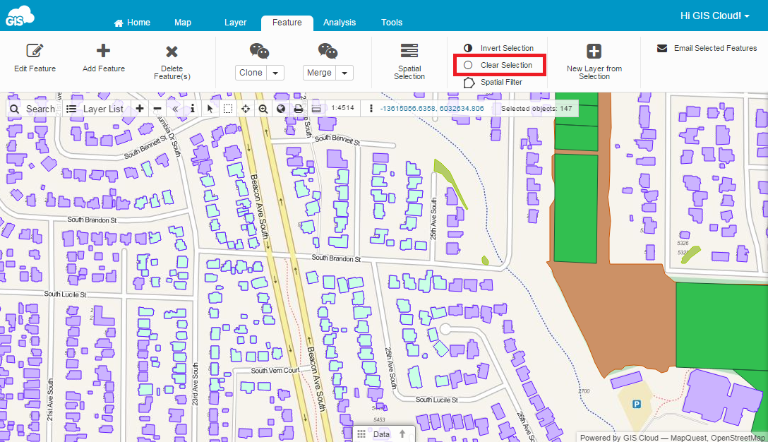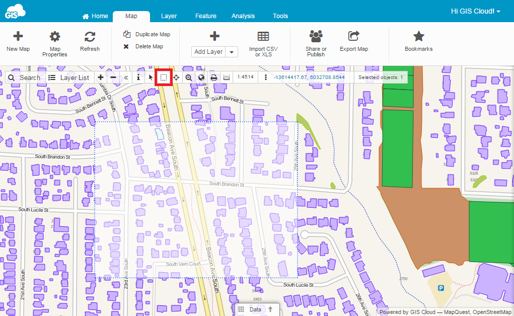 Multiple features may be selected at once. There are several ways to select multiple features in GIS Cloud. It is possible to define selected features color.