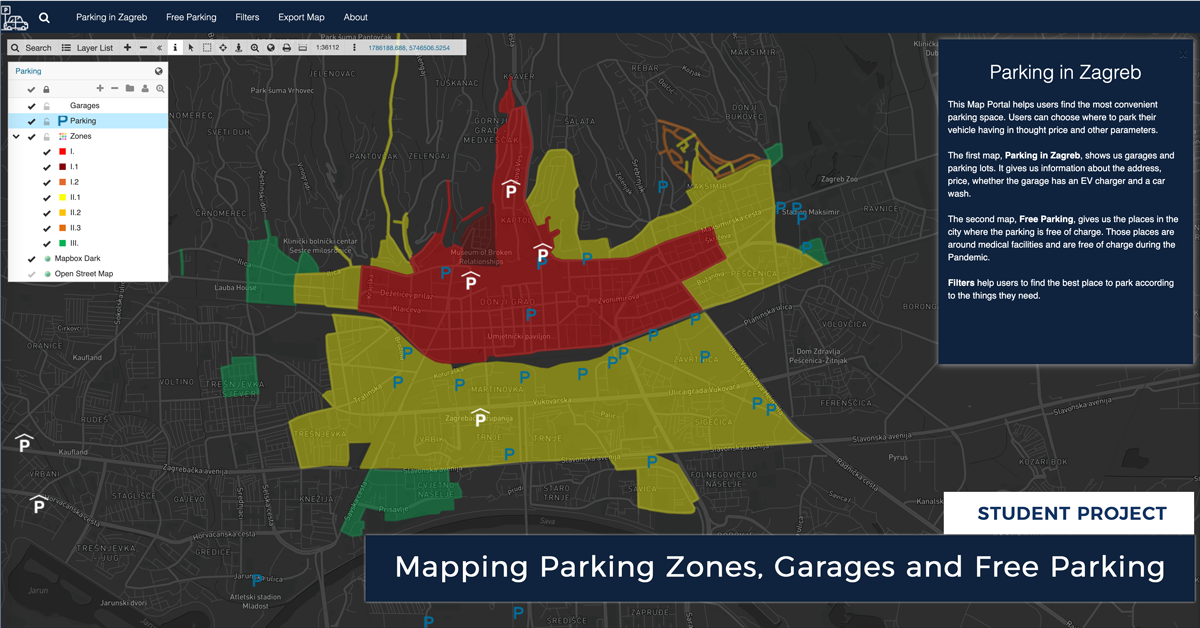Using the GIS Cloud App Builder, the layout of the Map Portal was edited and organized. Users can switch between two maps, Parking in Zagreb, with garages and parking lots, and Free Parking, with areas free from parking charges.